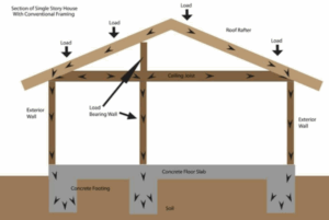 A load bearing wall supports the weight of a floor or roof structure above and are so named because they bear a load. A non-load bearing wall is responsible only for holding up itself.