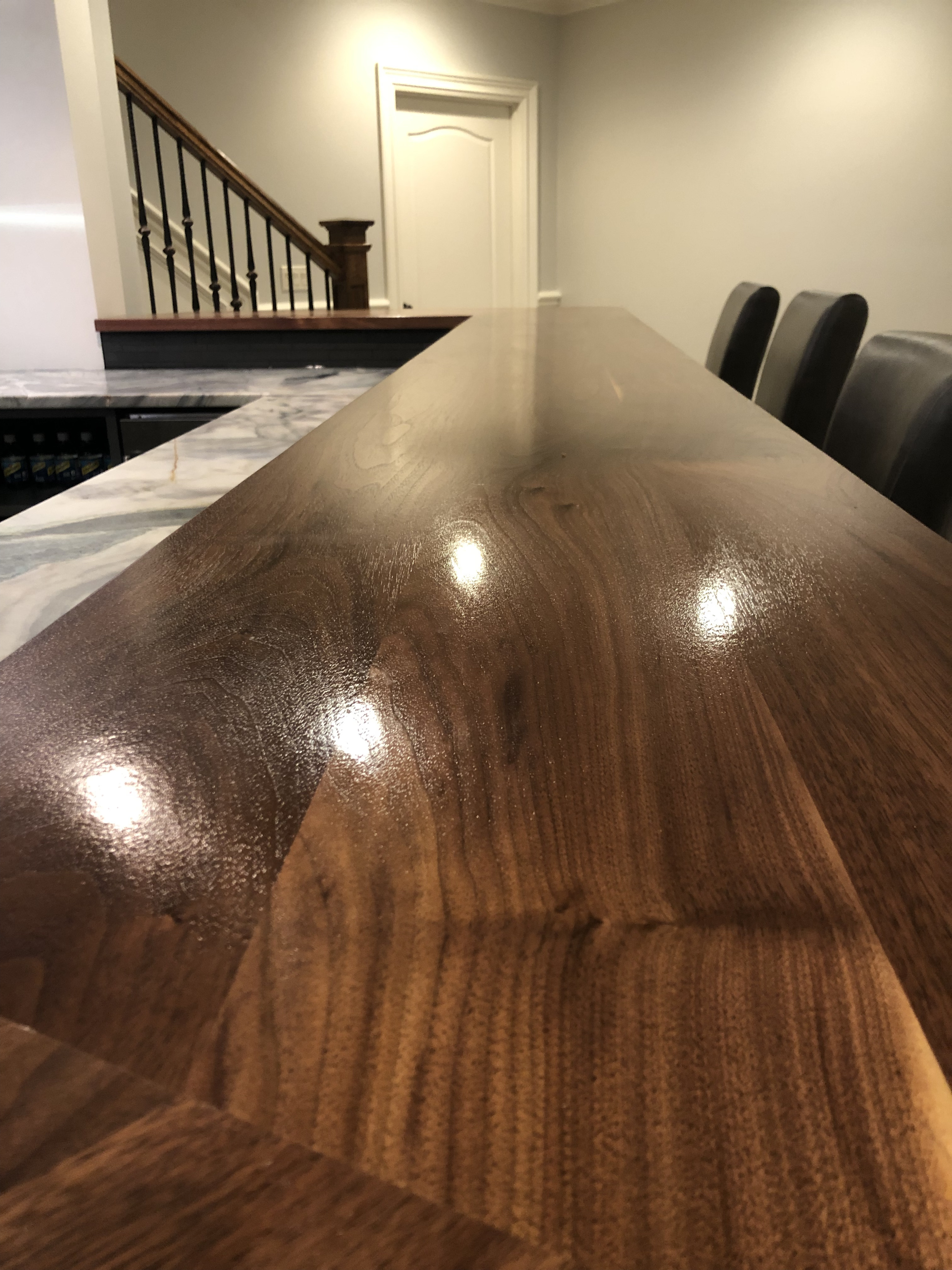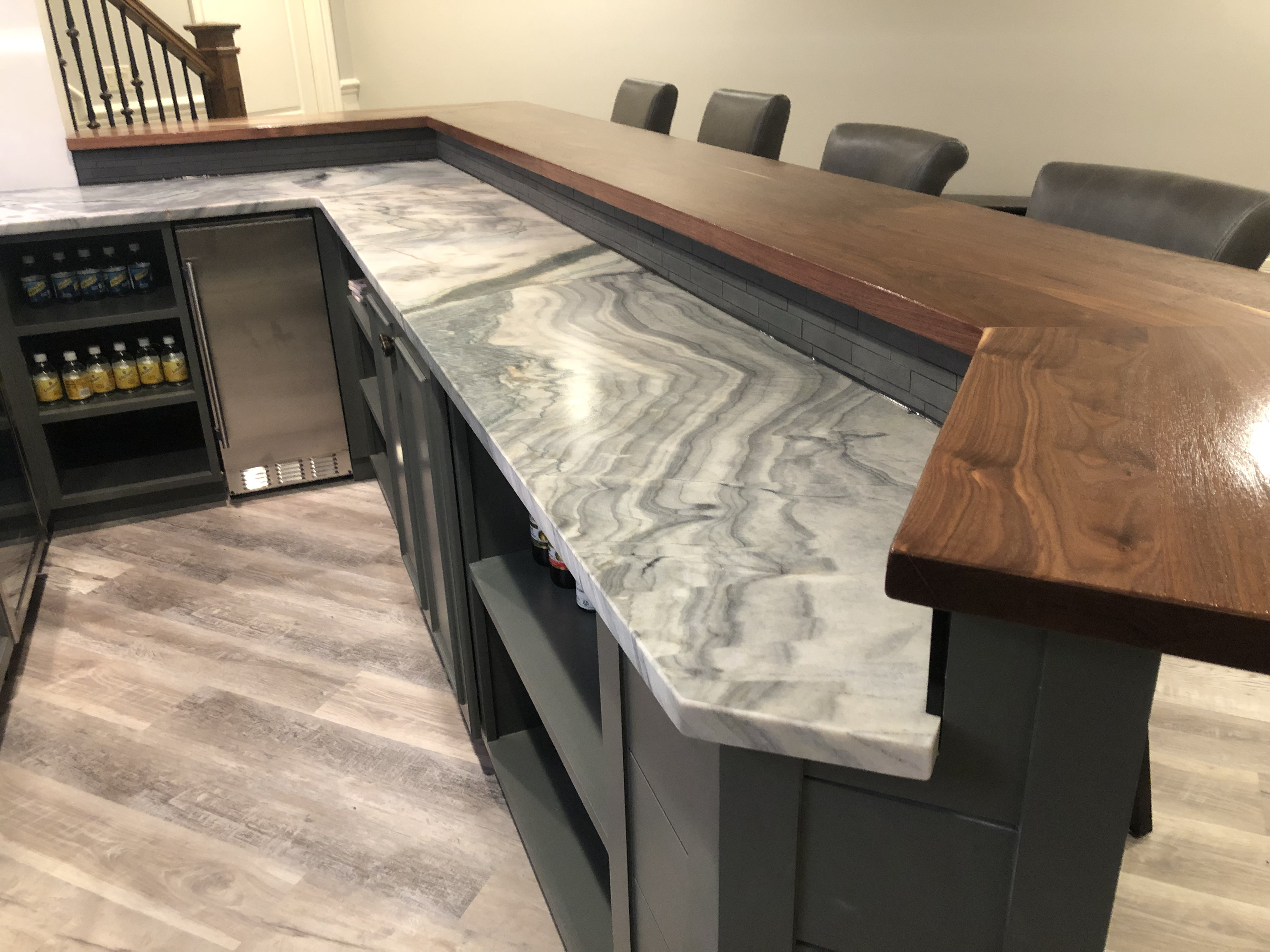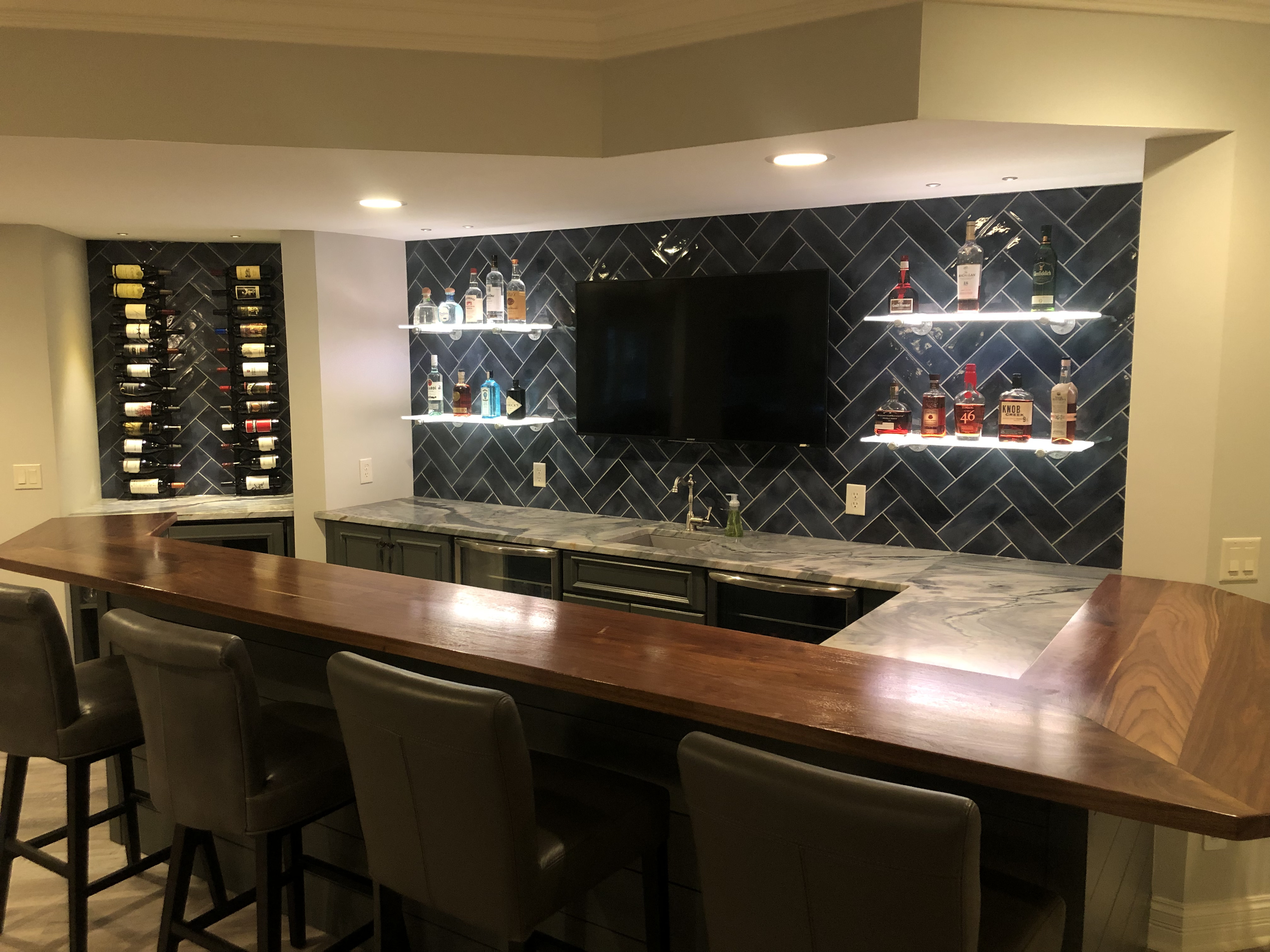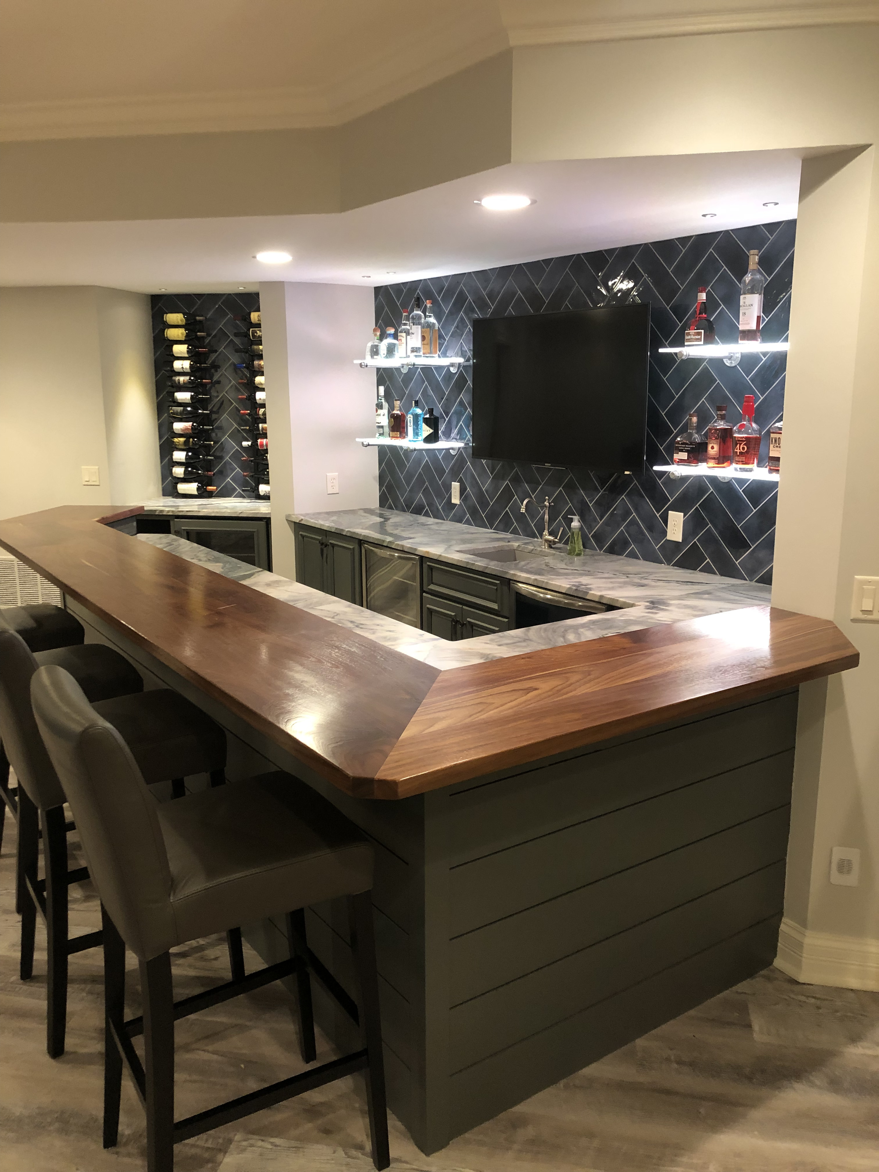 - Transformation of the basement bar area, including removal of existing elements, new cabinetry, shelving, countertops, and updates to lighting and plumbing.