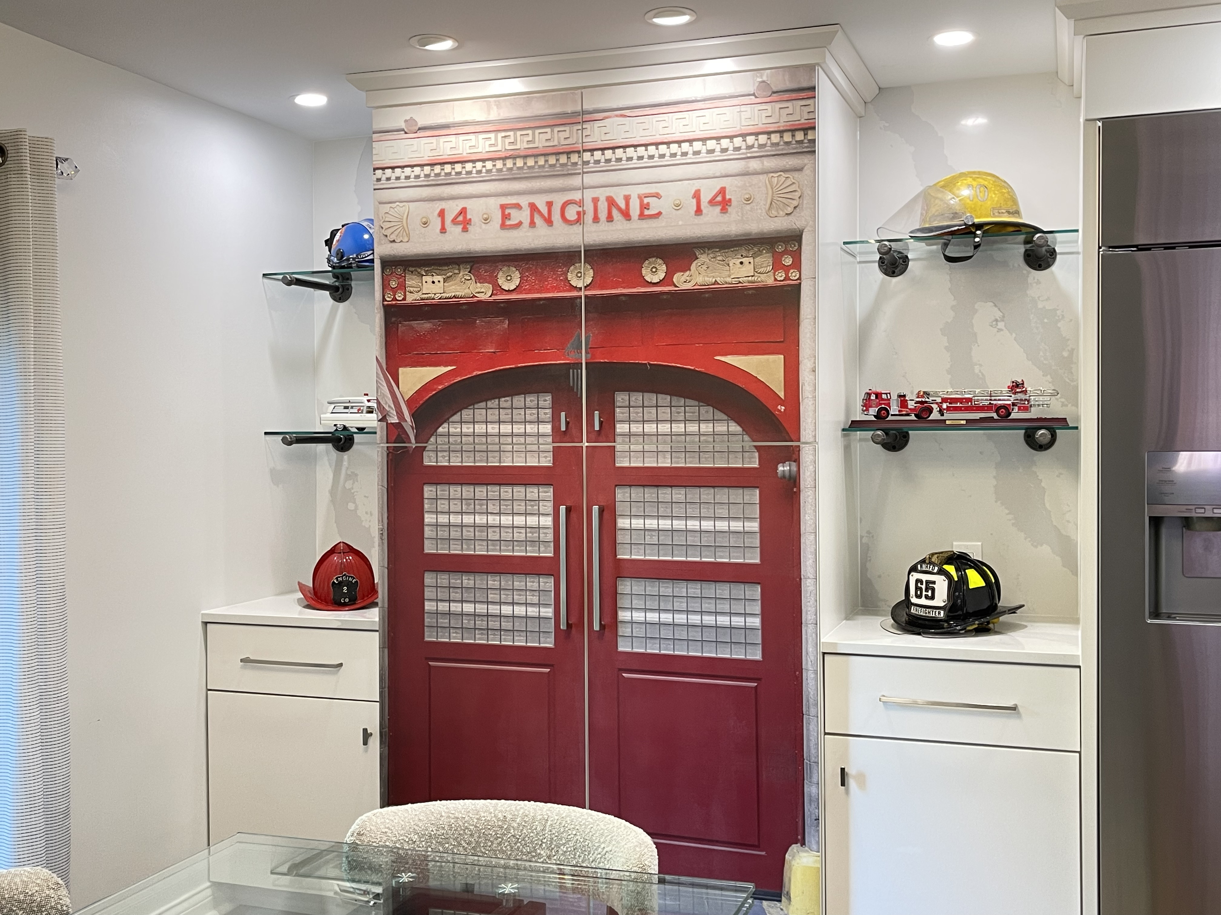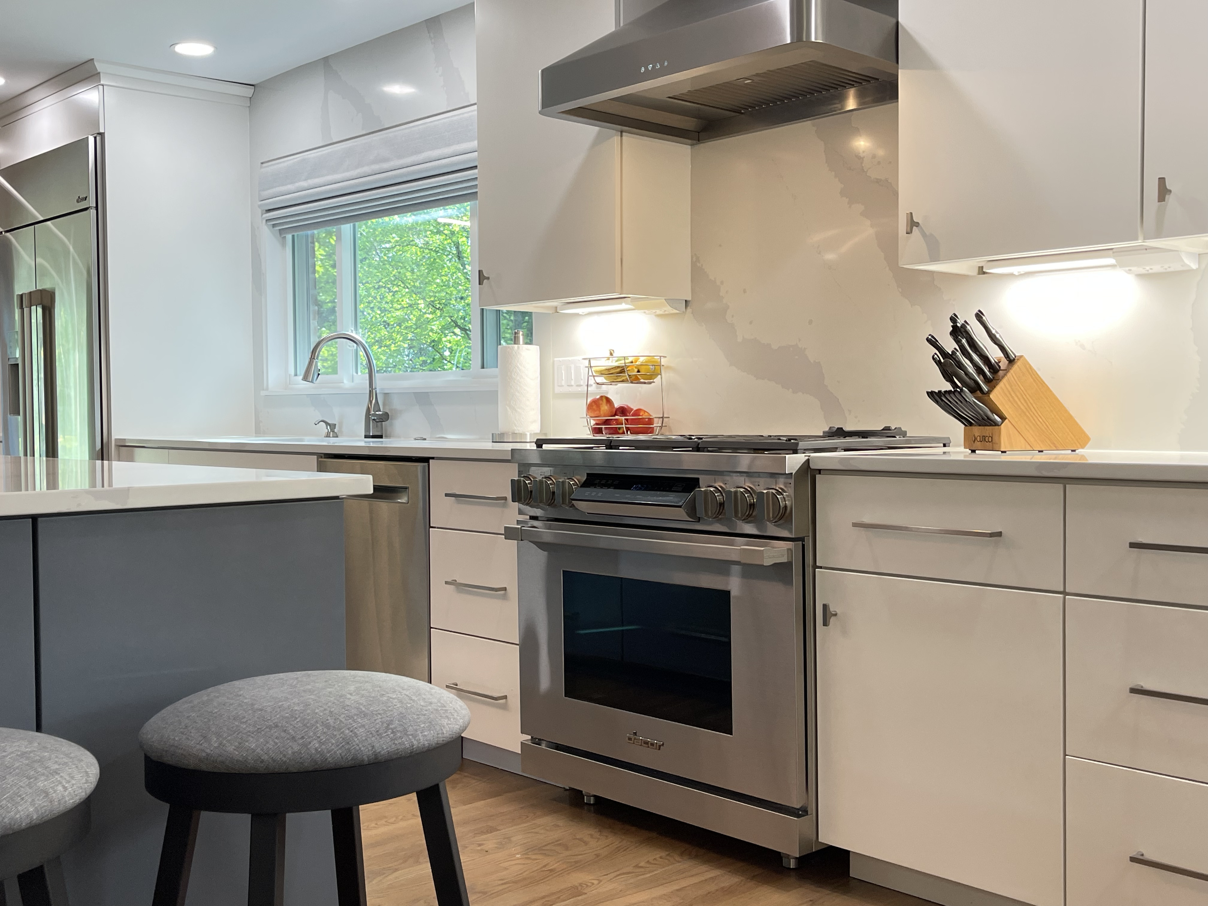 The kitchen is now the heart of the home, featuring a spacious island adorned with luxurious marble countertops and ample storage. Our clients desired a dedicated workspace, so we thoughtfully incorporated a desk set up next to one of the kitchen windows, perfect for enjoying natural light while working. Additionally, a custom filing cabinet was installed, blending seamlessly with the kitchen’s elegant design.