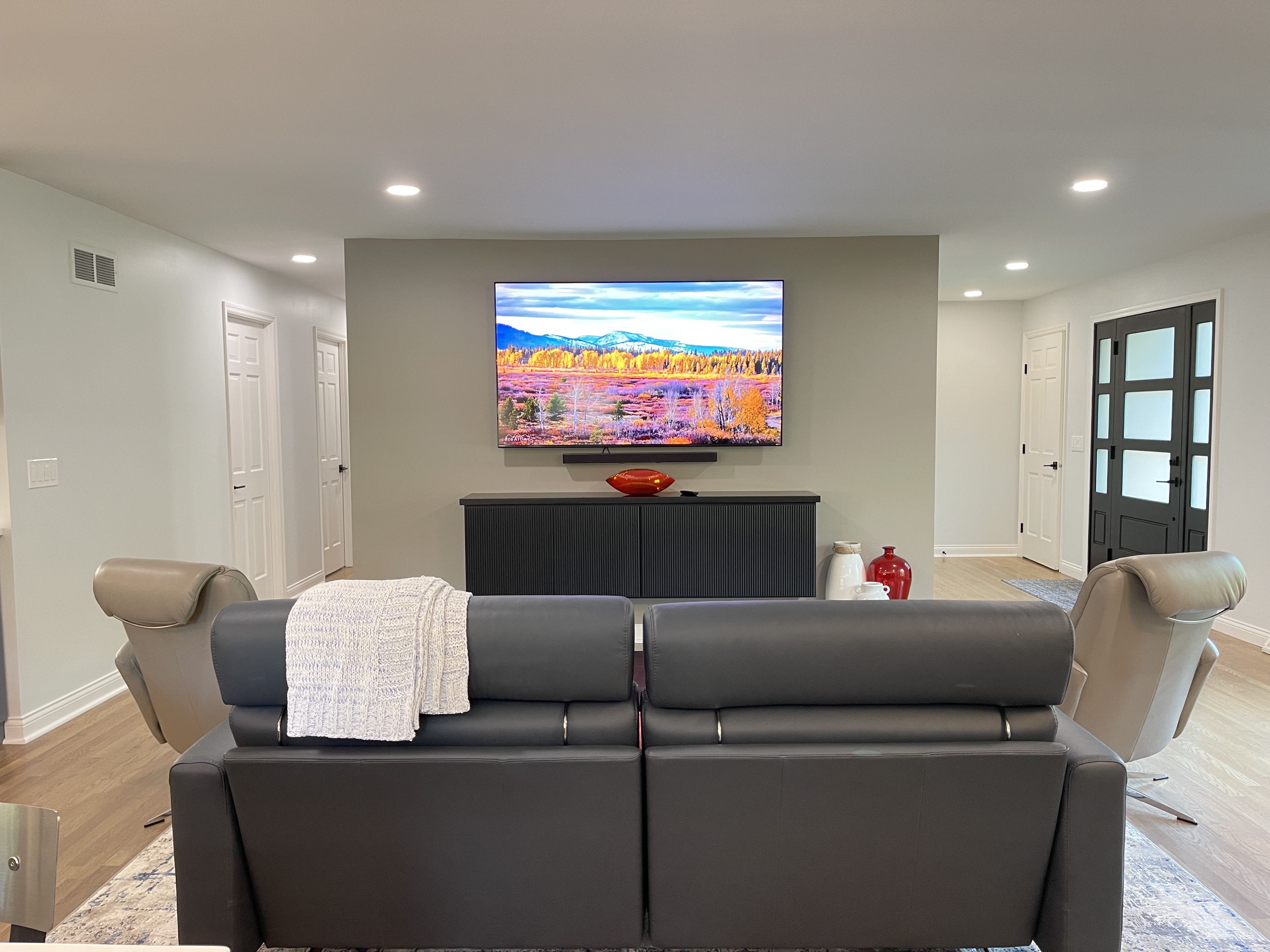 In the living room, we designed and built a sleek floating TV stand, tailored to our client's preferences, enhancing both functionality and aesthetic appeal. This custom piece not only supports the entertainment setup but also adds a modern and clean look to the space.