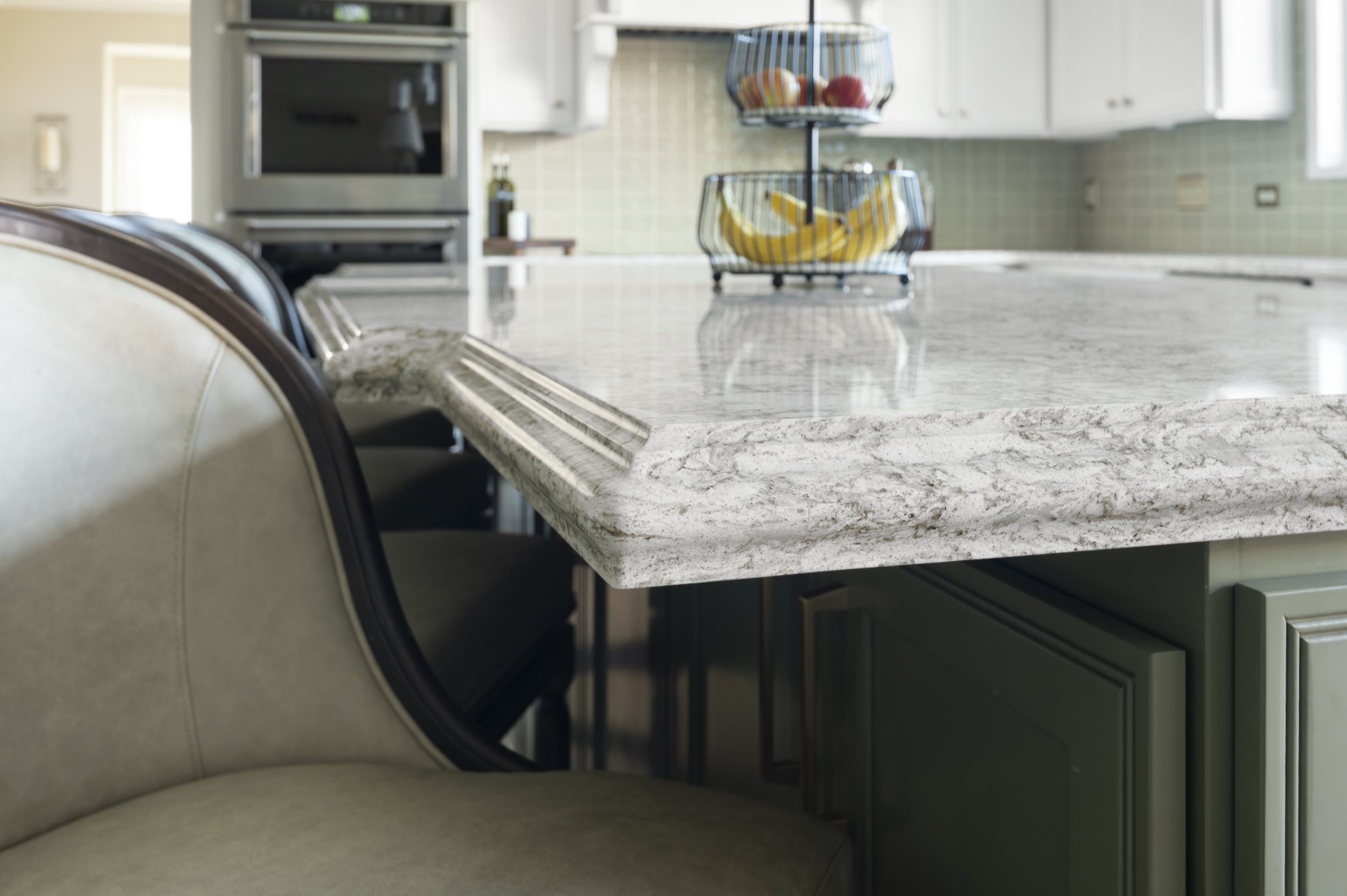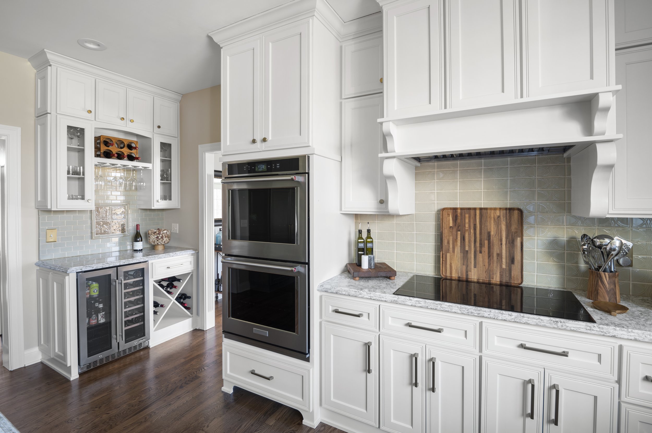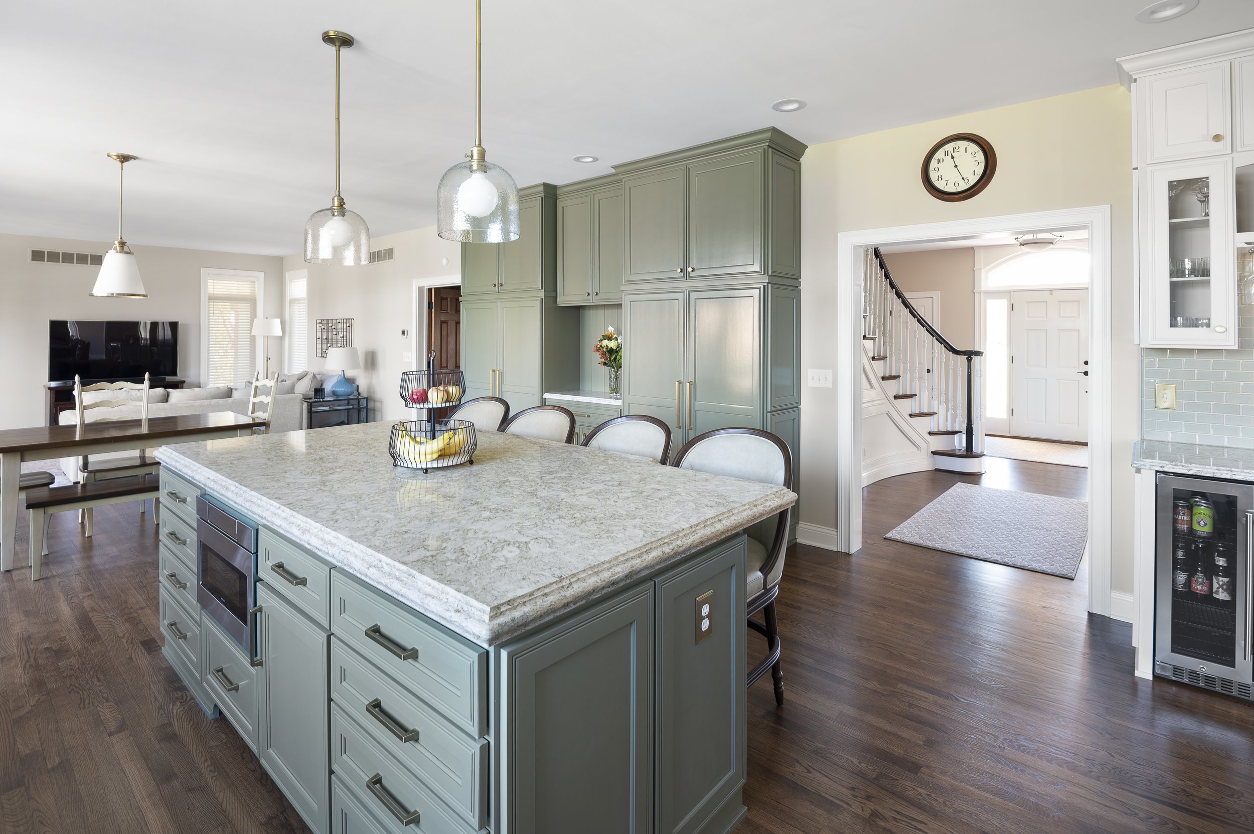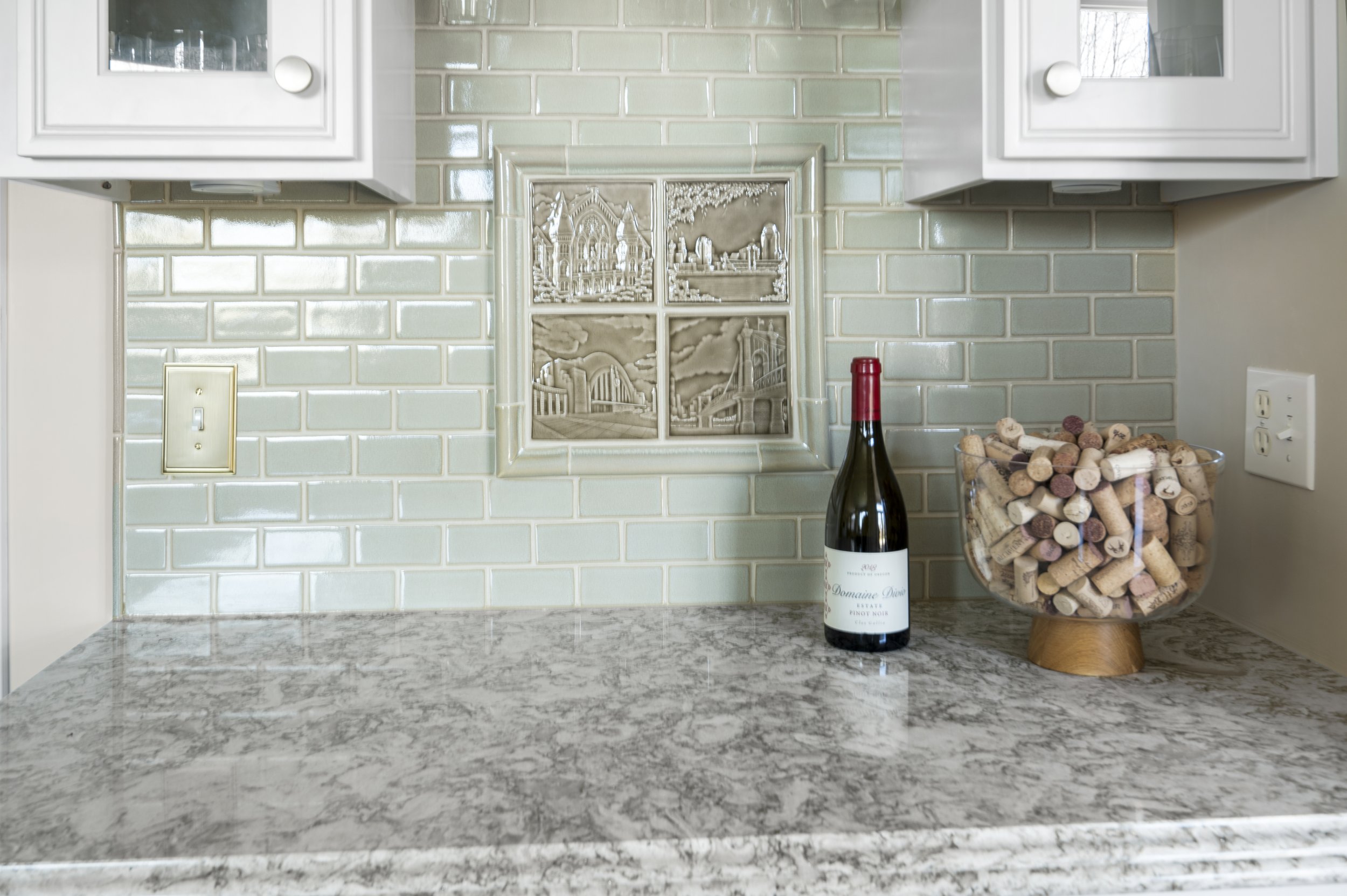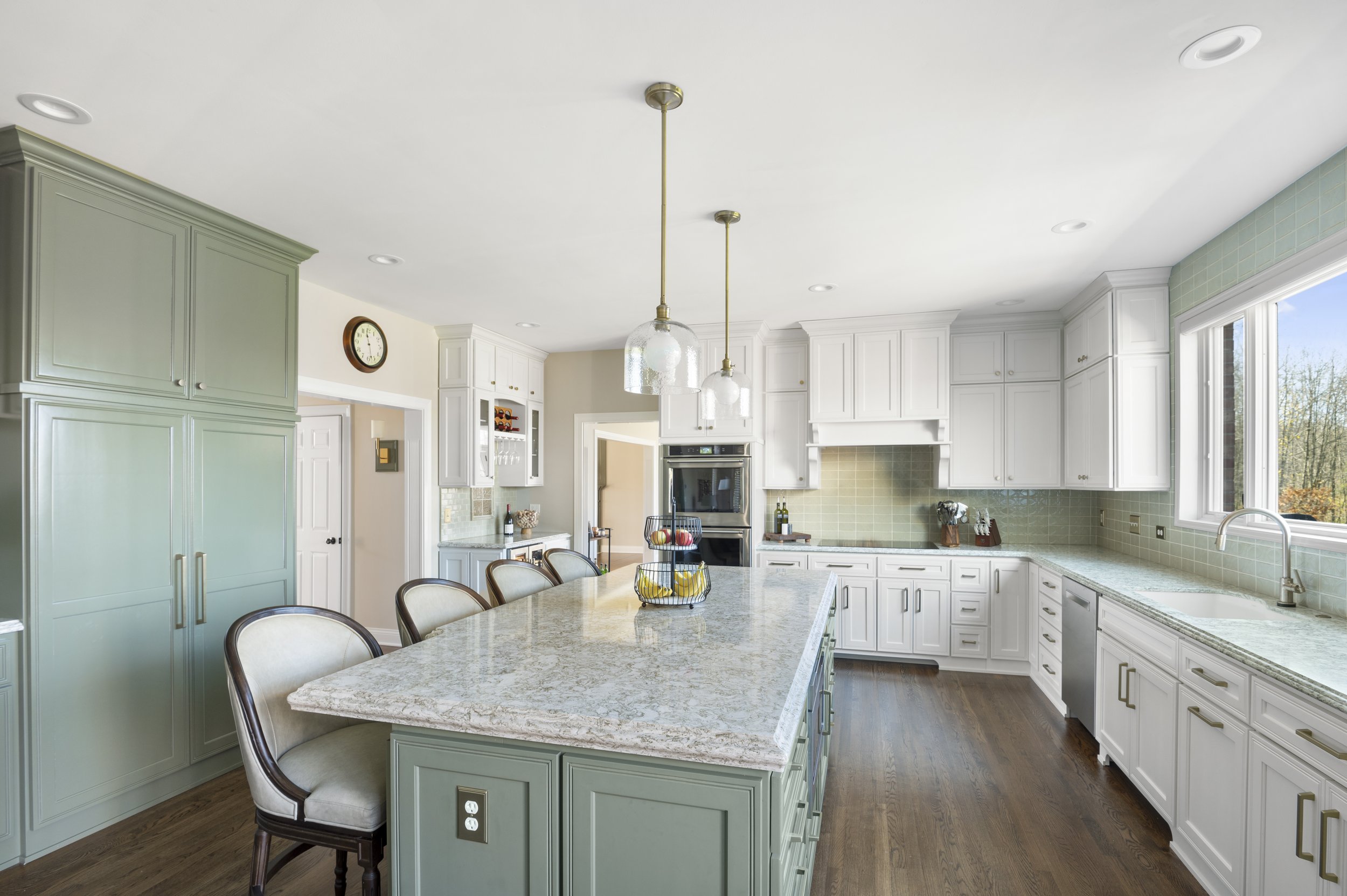 Custom Amish cabinetry was installed, replacing a closet-style pantry with a sleek, 10-foot expanse of floor-to-ceiling pantry cabinets. A large island, custom cabinetry, and an elegant backsplash added to the modern design of Patti Johnson Interiors, further enhanced by stainless steel appliances. The handmade Rookwood Pottery tile backsplash perfectly matched the new color scheme, with hints of green adding a decorative touch.